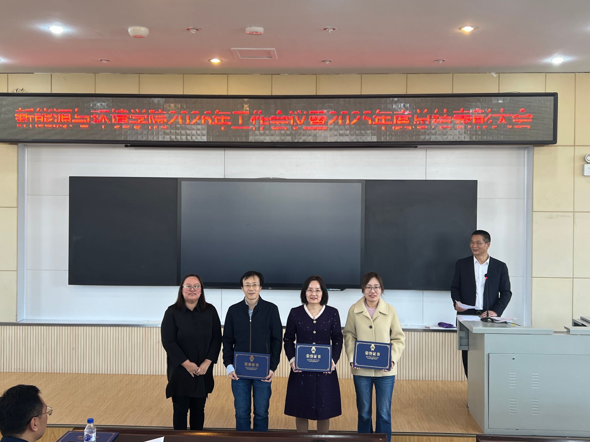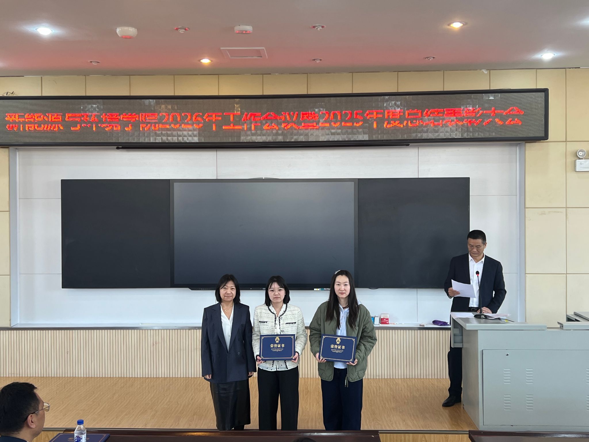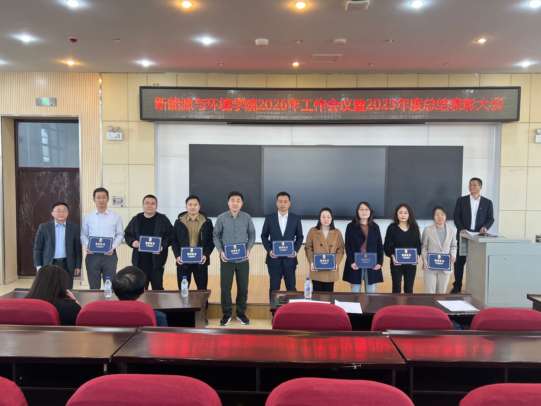 在北区理化楼召开2026年学院工作会议暨2025年度总结表彰大会,学院全体教职工参加了会议,会议由徐军副院长主持。